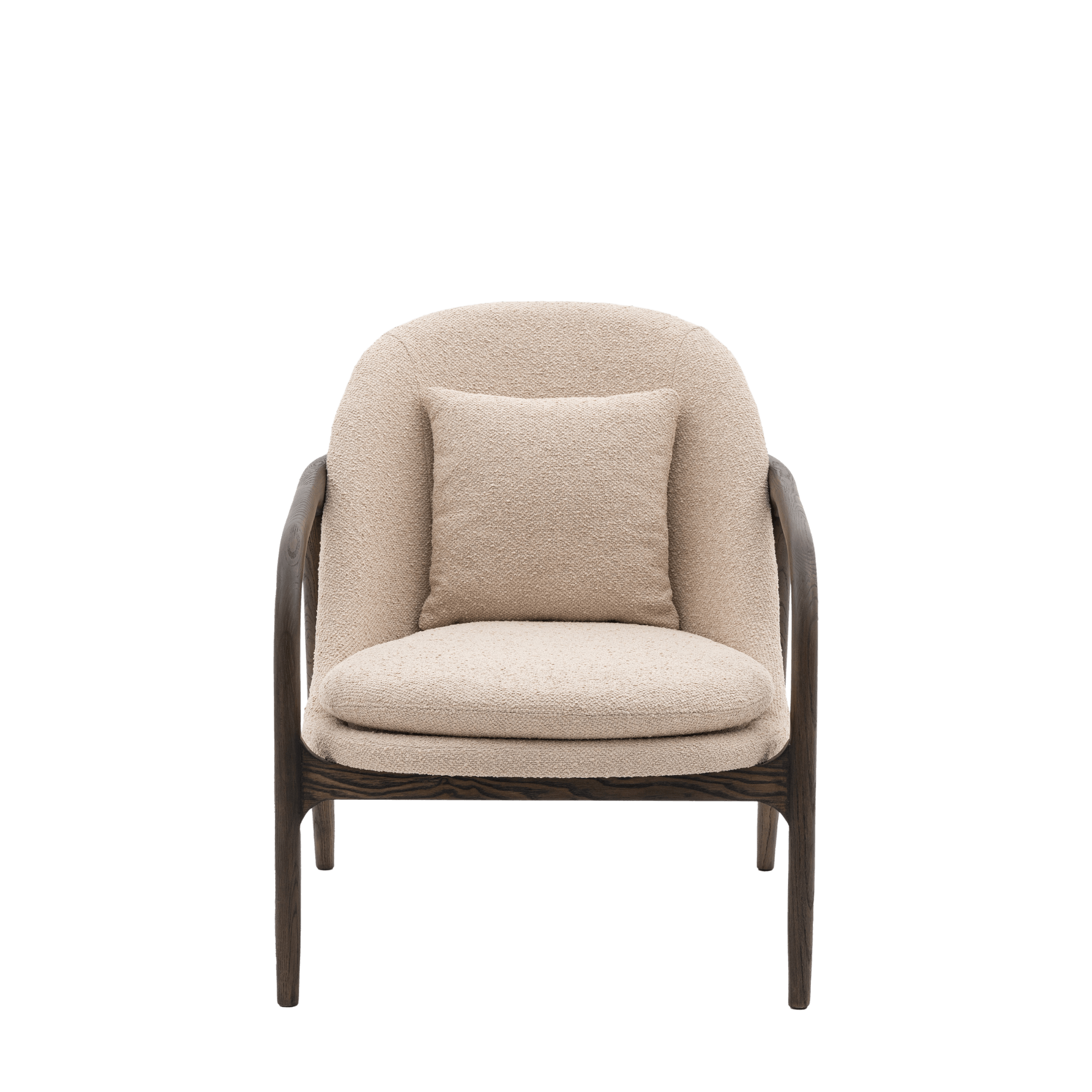Mid-Century Modern Design: Sleek curved lines and luxurious taupe fabric create a timeless vintage look. Oak Frame: Natural beauty and durability for long-lasting style. Plush Cushioning: Padded seat and back cushions ensure ultimate comfort. Comfy Seat Width: Ample space to relax in style (58cm between arms). Easy Care Fabric: Polyester upholstery for easy cleaning. Dimensions (cm): W68, D84, H83, Seat Height 42, Seat Depth 50, Clearance to Floor 42Product Specification