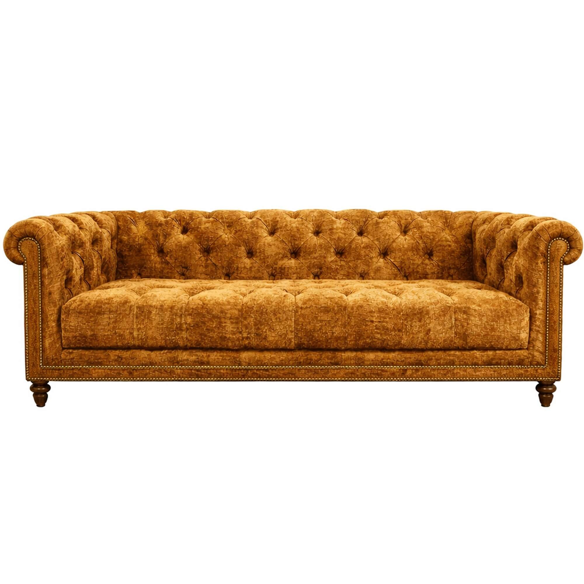 - Classic Chesterfield-style sofa with deep button-tufted back and arms