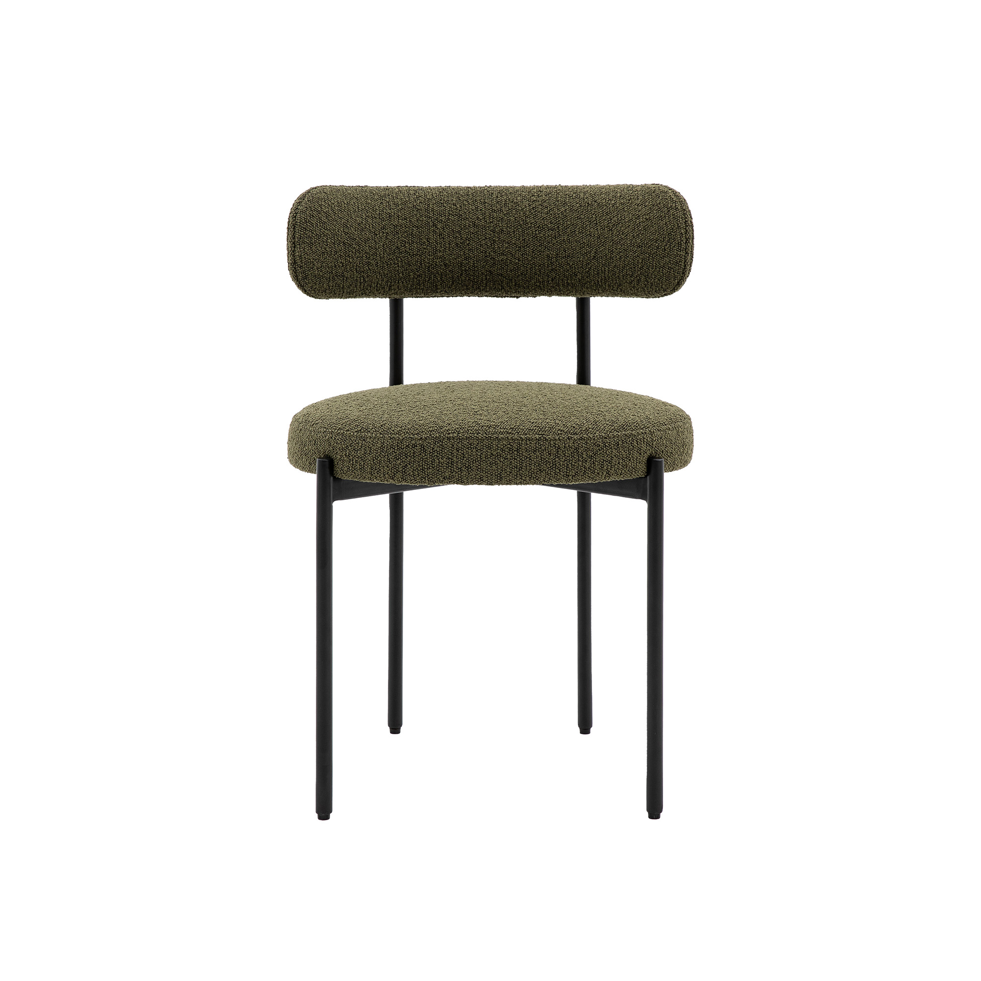 Enhance your dining space with our Aveley chair. Upholstered in a beautiful green fabric, the rounded seats and curved backrests create a sleek, cohesive look. Supported by sturdy black metal legs and frame, they offer both durability and modern appeal. Also available in a range of colours to suit your décor.