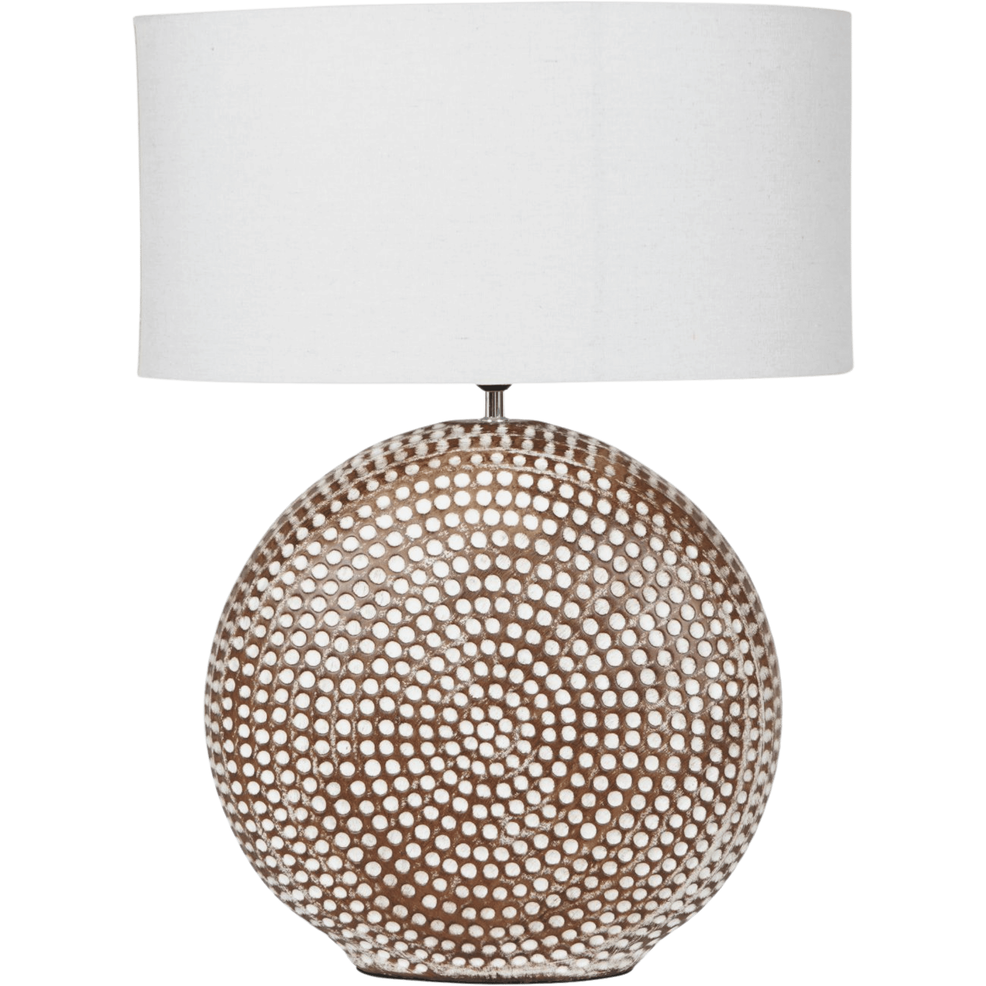 The Chariot Round ceramic table lamp features hand-finished dimples, an antique cream and brown glaze, and a linen shade. Its slim profile makes it ideal for sideboards, ledges, and hallways.