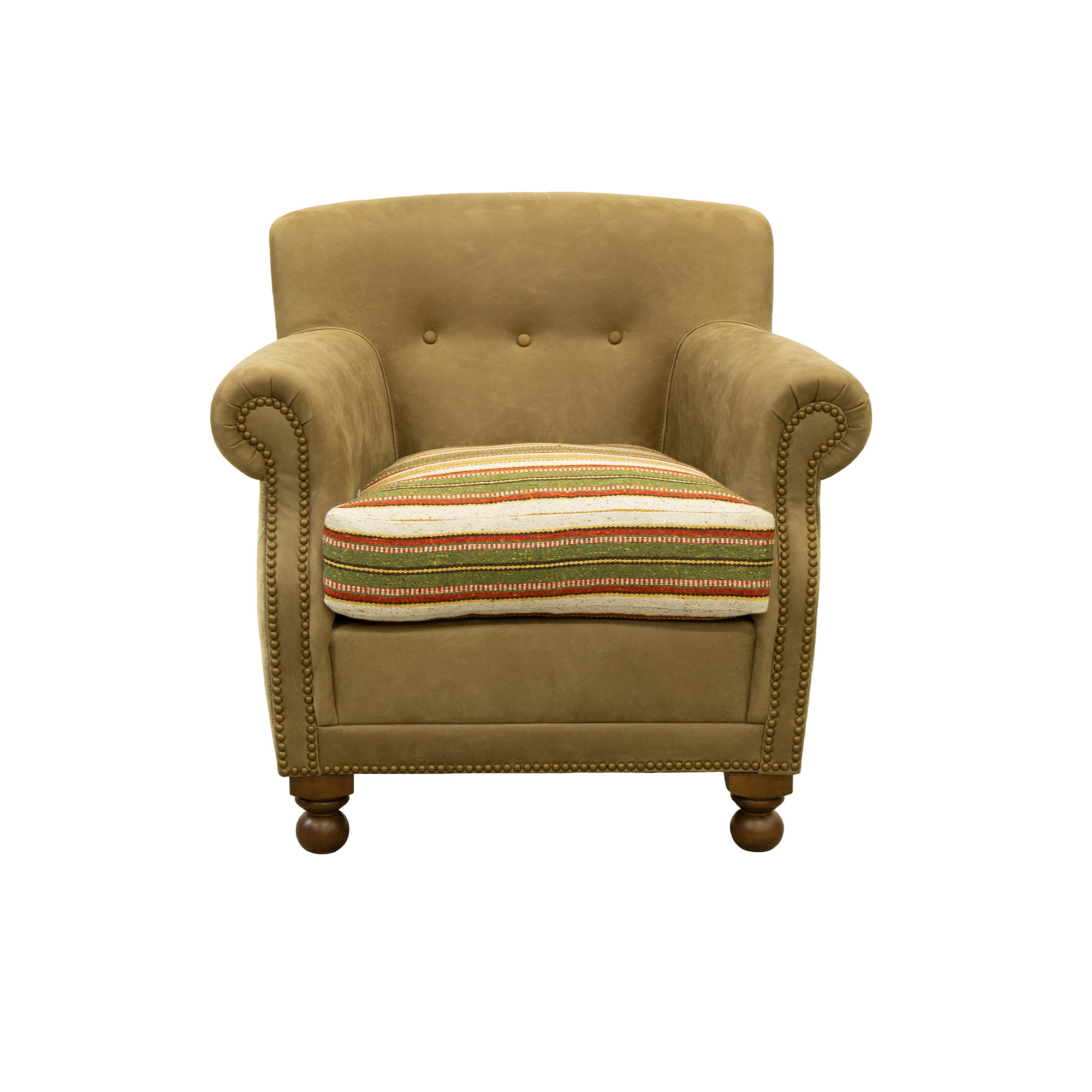 - Loose, thick seat cushion with a striped, multicoloured fabric cover for contrast and added comfort