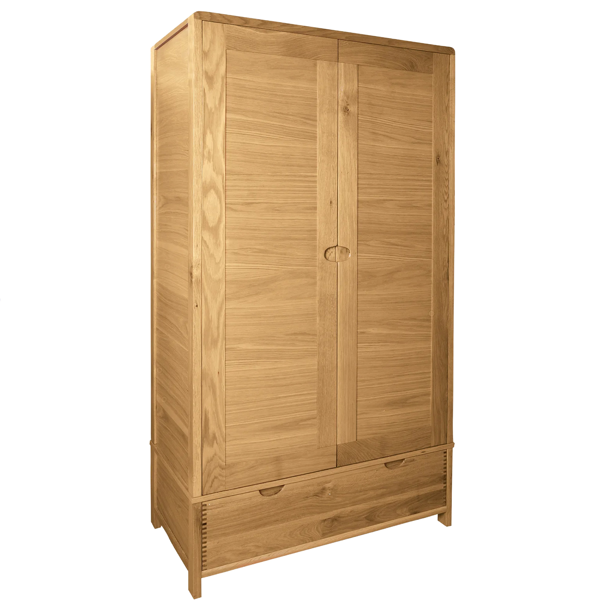 Inside, a full-width hanging rail provides ample space for clothing, while a spacious bottom drawer offers additional storage for folded garments, linens, or accessories. The clear matt lacquer finish highlights the natural warmth and grain of the oak, enhancing its timeless appeal while providing long-lasting protection.