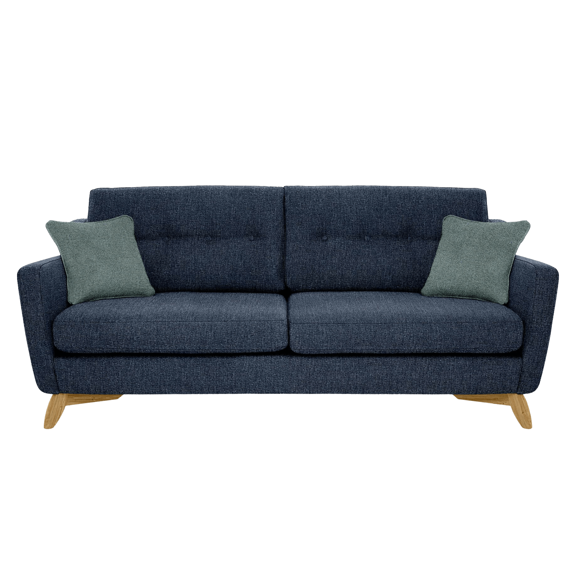 Features: Deep buttoned back cushions, reversible seat and back cushions (fabric only), two feather and fibre scatter cushions, solid oak show-wood legs