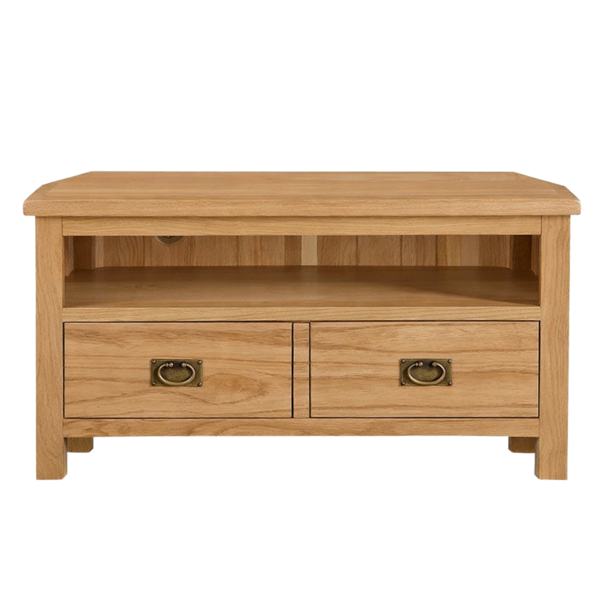 Crafted from beautifully grained oak, this corner TV unit blends timeless style with practical design. Its space-saving shape fits neatly into a corner, while the open shelf with cable management and two spacious drawers keep your media essentials organised. Finished with antique-style metal handles, it brings warmth and character to any living space.