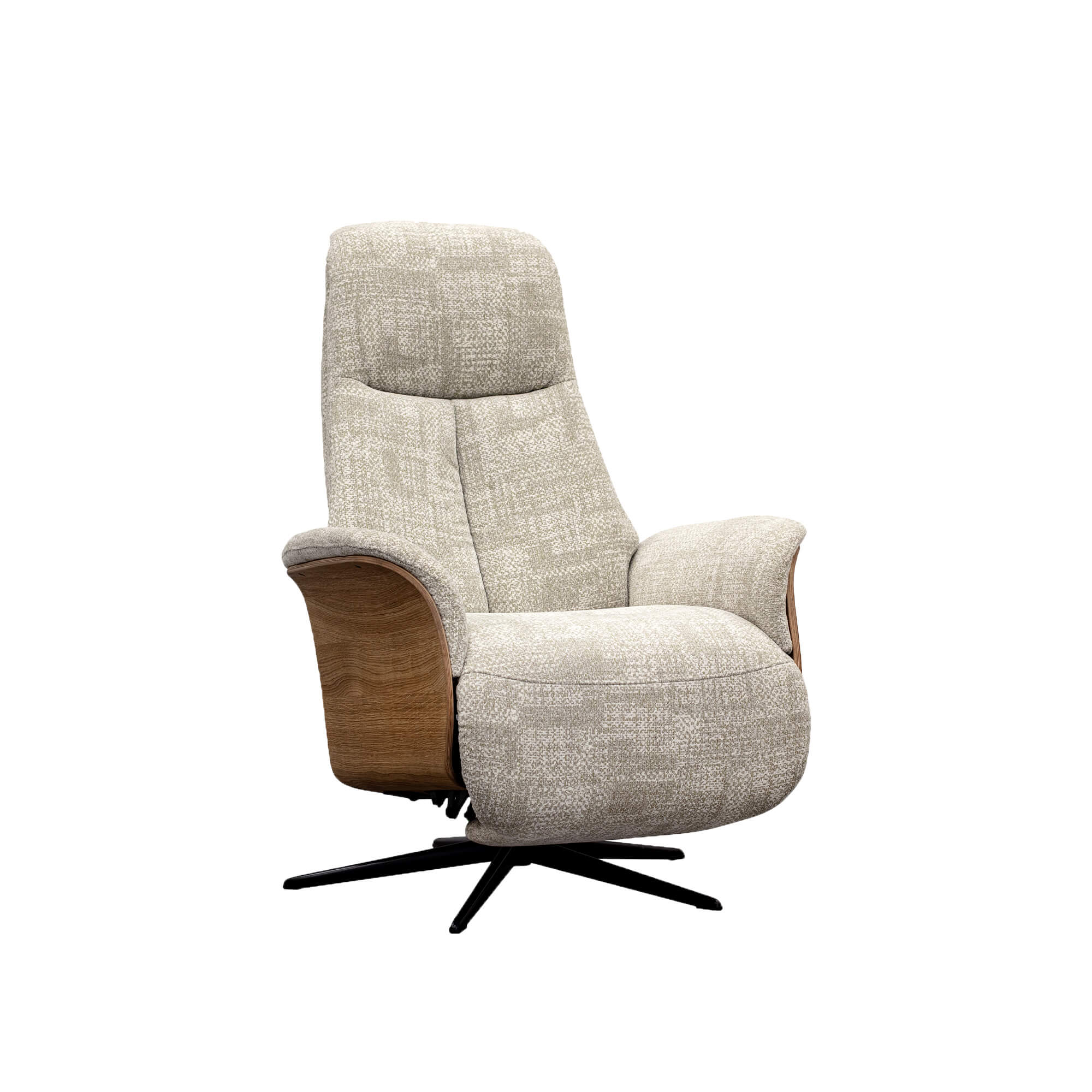 Construction: Upholstered recliner chair with dark wood veneered side panels.