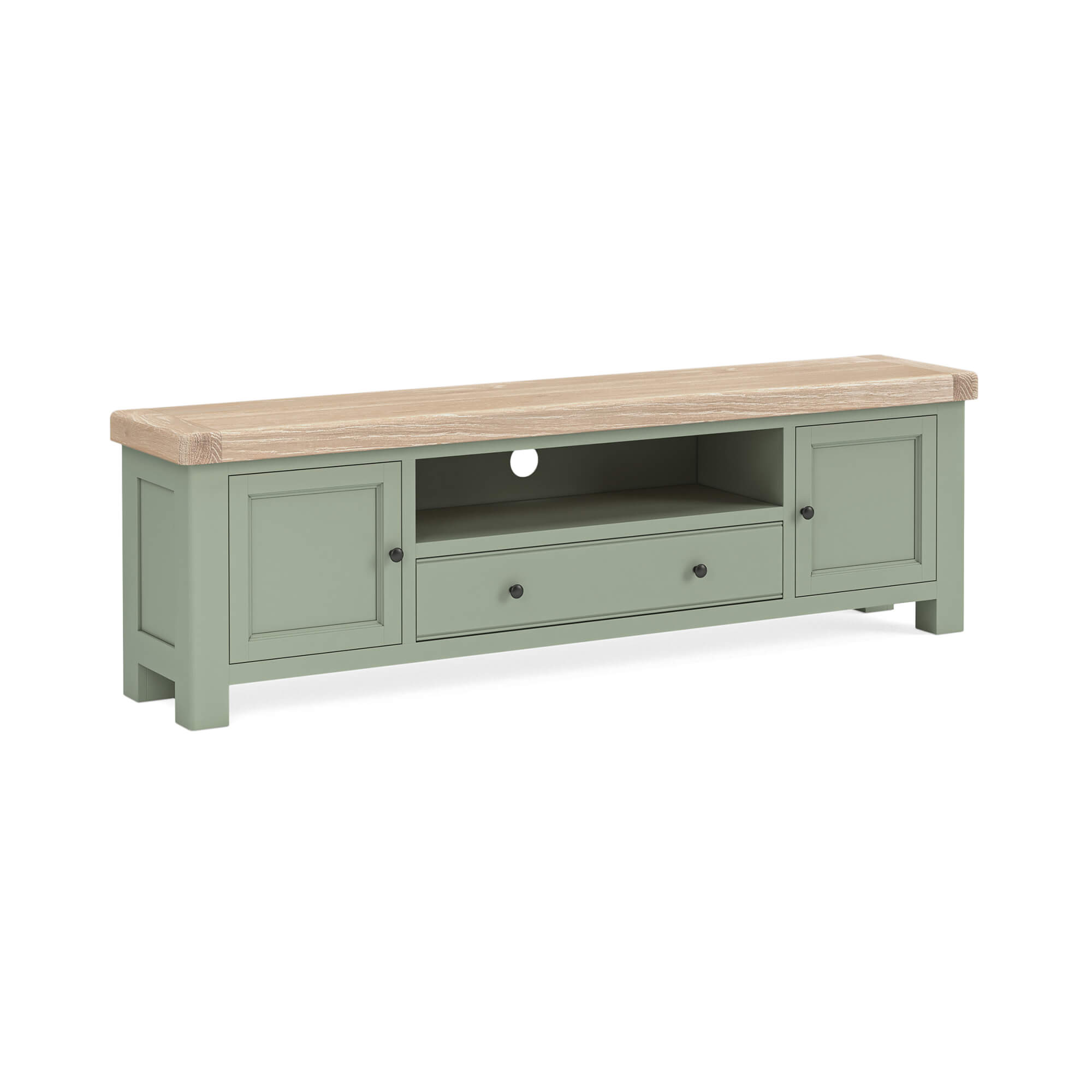 The Harbour Sage TV Unit 1900 is a stylish and practical living room piece designed to bring classic character and everyday function to the home. Using the matched Salcombe range for sourcing, it features a soft sage painted finish with contrasting oak tops, creating a calm, relaxed look that works beautifully in both traditional and more contemporary interiors. Furniture World describes the Salcombe collection as painted with oak tops, with the oak finished in a durable white wash oil to give the range a soft aesthetic. The collection is also designed to bridge the gap between traditional and contemporary interiors, with chunky proportions and generous storage that help give it a reassuringly solid, timeless feel. As a 190 cm TV unit, it provides a practical surface for a larger television along with useful media storage to help keep the living space neat and organised.