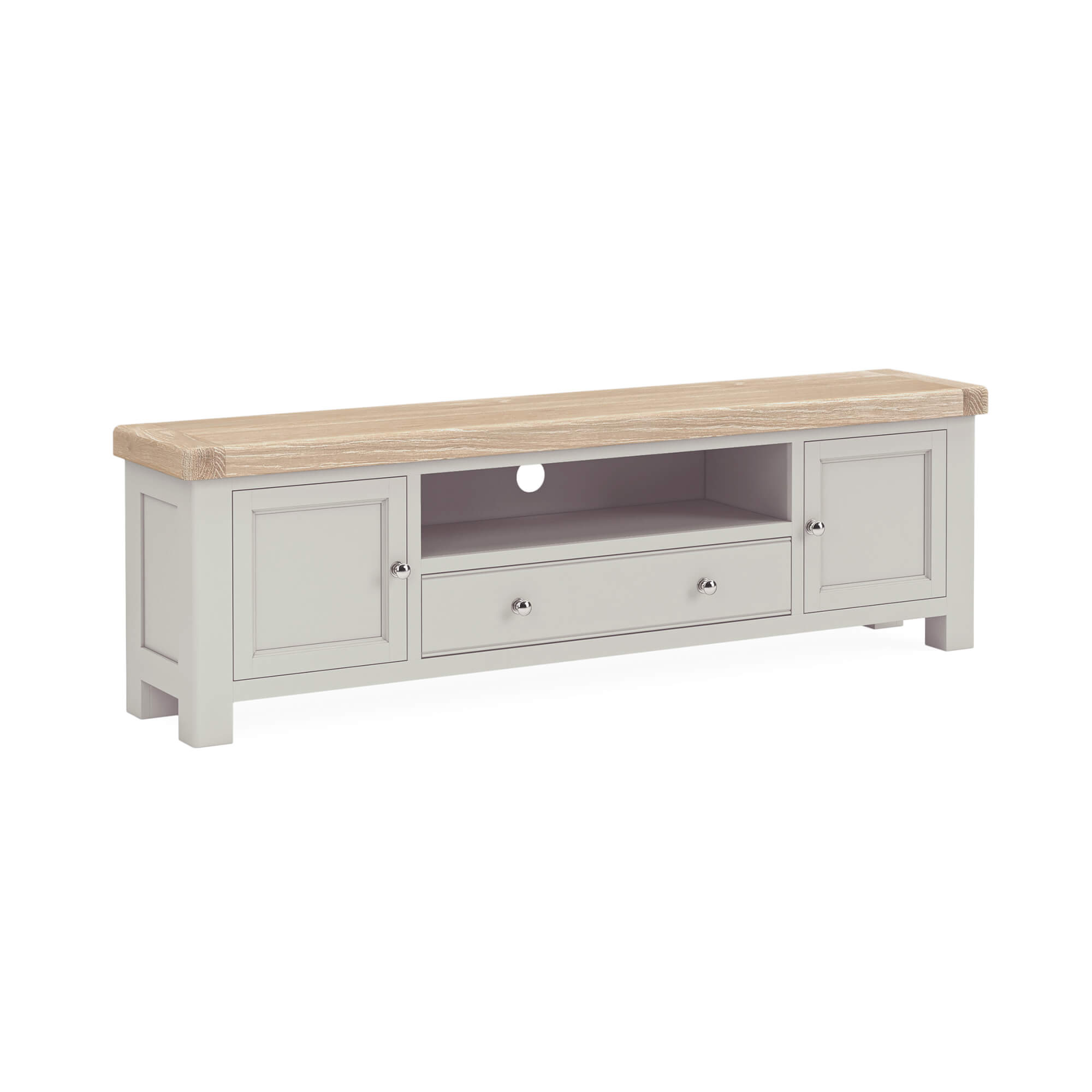 The Harbour Stone Grey TV Unit 1900 is a stylish and practical living room piece designed to bring classic character and everyday function to the home. Using the matched Salcombe range for sourcing, it features a soft stone grey painted finish with contrasting oak tops, creating a calm, relaxed look that works beautifully in both traditional and more contemporary interiors. The oak tops are finished in a durable white wash oil, giving the piece a gentle, understated aesthetic while still allowing the natural beauty of the wood to show through. The collection is designed to bridge the gap between traditional and contemporary interiors, with chunky tops and legs and generous sizing that offer plenty of storage. Furniture World also lists wood and oak among the product features.