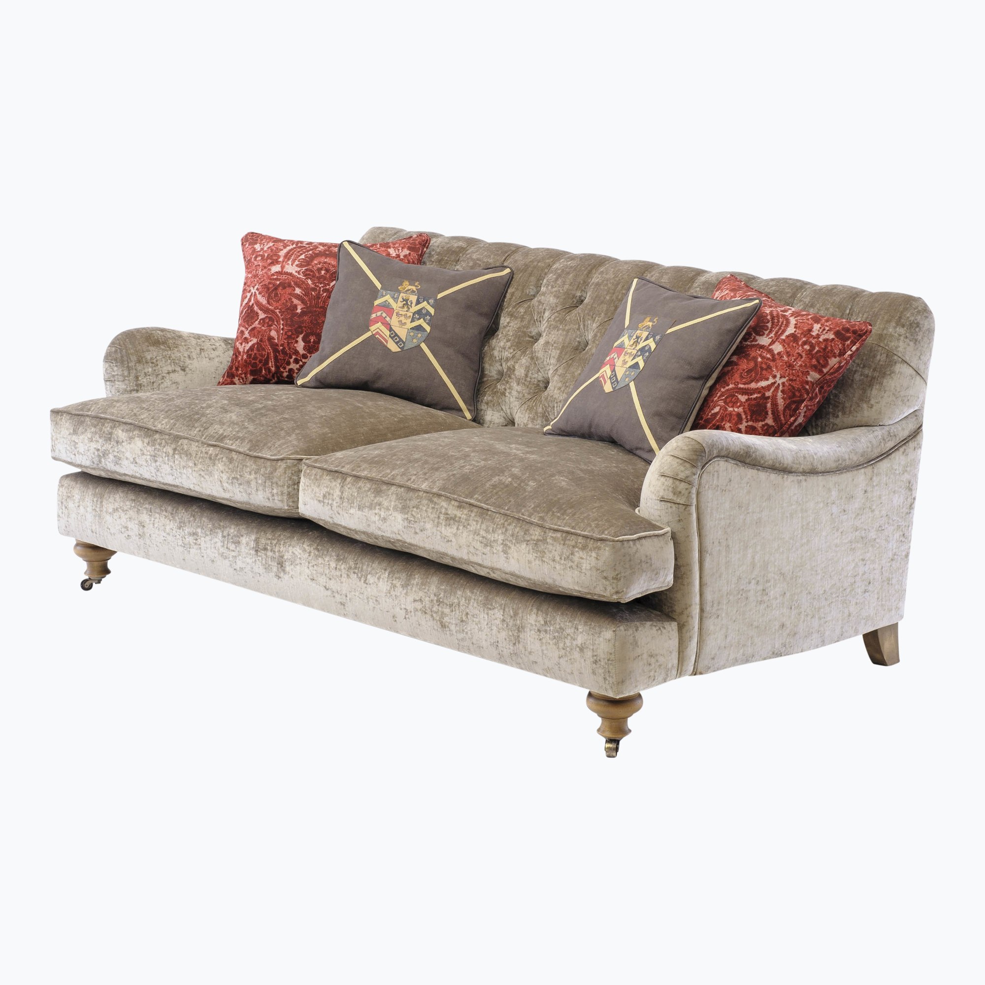 Hardwood rails with engineered MDF sections Glued and dowelled Spink & Edgar pocket springs in seating base with foam overlay Spink & Edgar pocket springs in arms with foam overlay Turned Ash hardwood legs Leg available in Grey or Brown finish, with or without castors Castors available brass or chrome Shown in Allure Azure and Royal Garden Sapphire *scatter not included