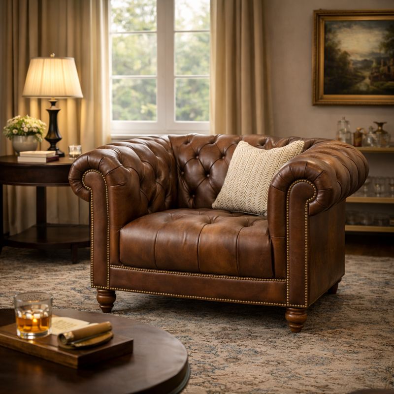The Highbury Snuggler is a beautifully proportioned accent chair that blends timeless design with indulgent comfort. Featuring deep buttoned upholstery, rolled arms and traditional stud detailing, this compact yet generous seat is ideal for curling up with a book or creating a cosy corner in your living space. Upholstered in rich leather, the Highbury Snuggler delivers classic character with enduring appeal.