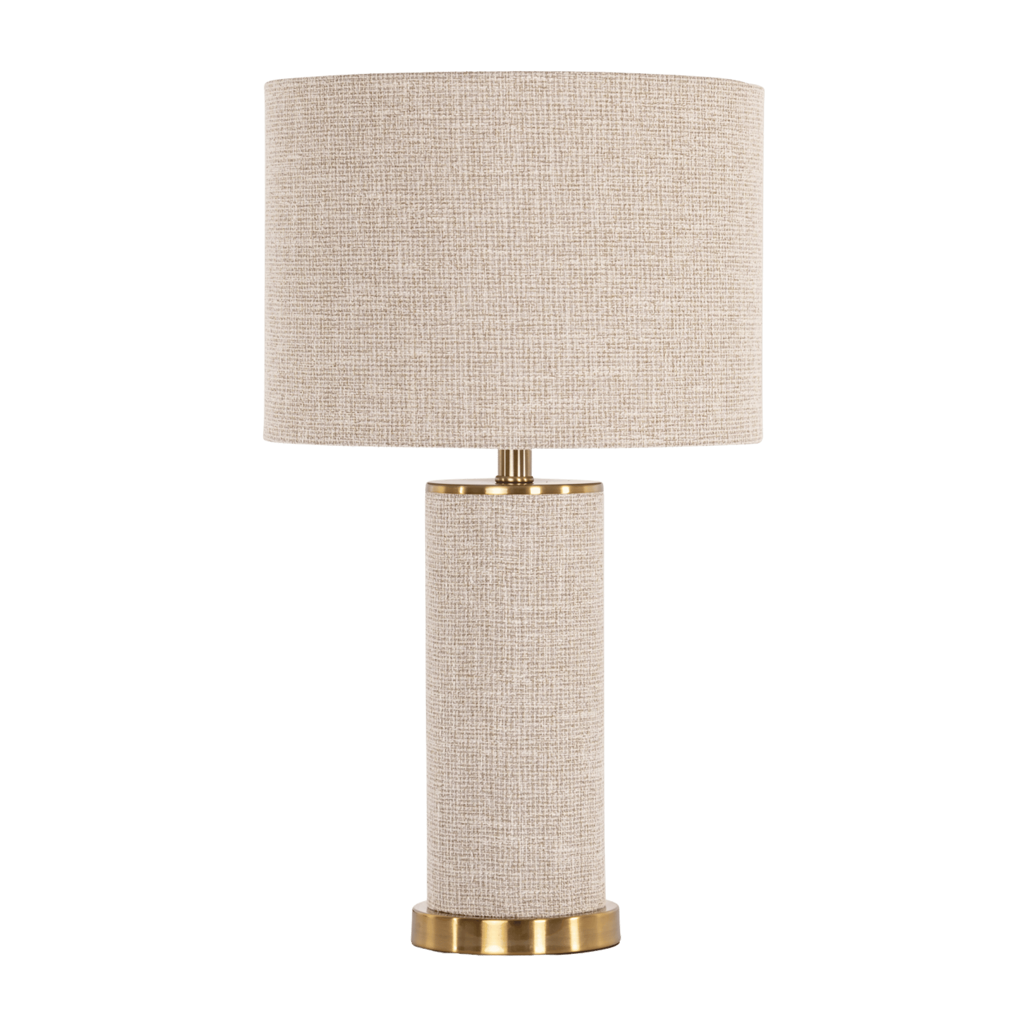 Joline beige linen table lamp with brass accents, perfect for bedside tables, living rooms and home offices, adding warm ambient light and soft modern texture.