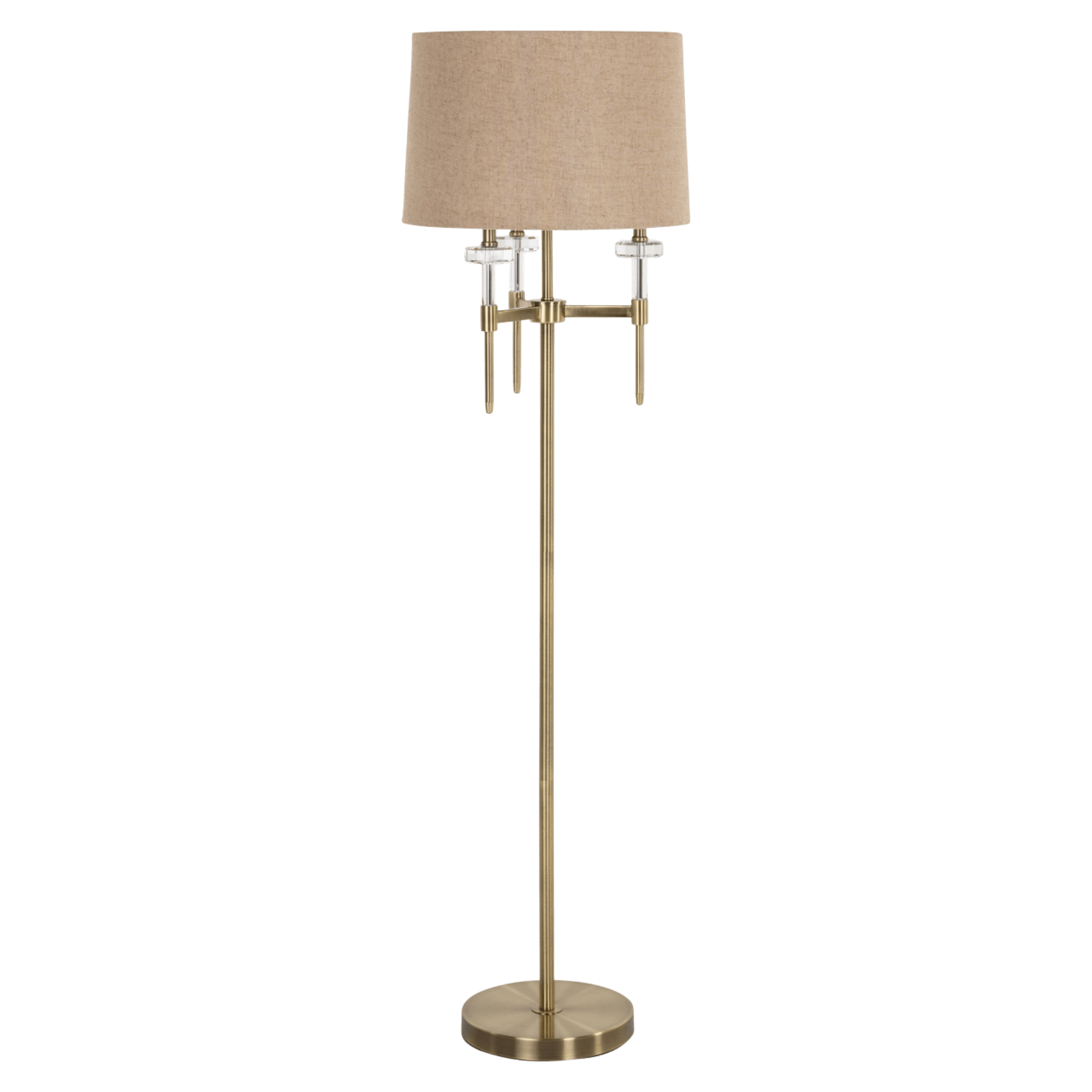 The Josie brass and crystal floor lamp brings a sophisticated Art Deco elegance to any room, pairing warm metallic tones with refined, modern detailing. Its slender brass stem and geometric accents introduce a luxe architectural feel, while the clear crystal elements add a delicate sparkle that catches the light beautifully. Finished with a soft, textured fabric shade in a natural warm tone, the lamp diffuses a gentle, inviting glow that enhances cosy living spaces, serene bedrooms or stylish home studies with effortless charm.