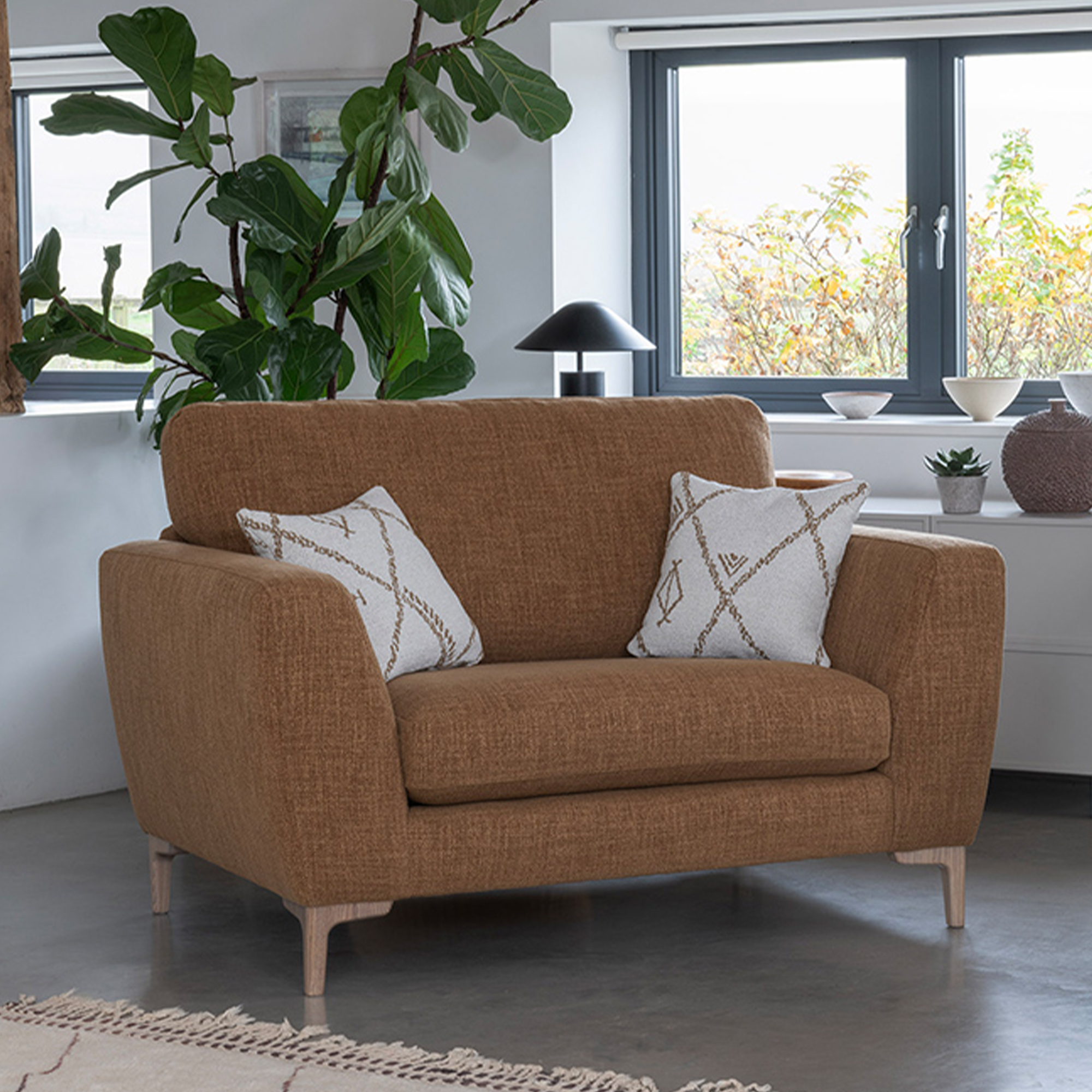 Drawing on Peru’s rich artistic heritage, the snuggler features fabrics in earthy browns, sunlit ochres, lush greens, and stone tones with vibrant copper accents. Geometric patterns, inspired by ancient motifs, create a subtle sense of connection. Deeply textured cushions offer comfort and visual depth, while hand-finished Ash legs. Available in light or dark, or brushed steel or matt black complete the premium design.
