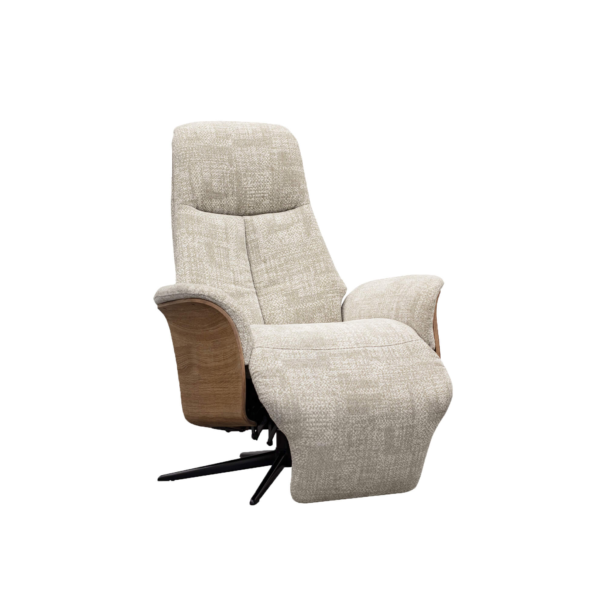 Mechanism: Manual recliner action with lever inside arm; footrest and headrest manually adjustable.