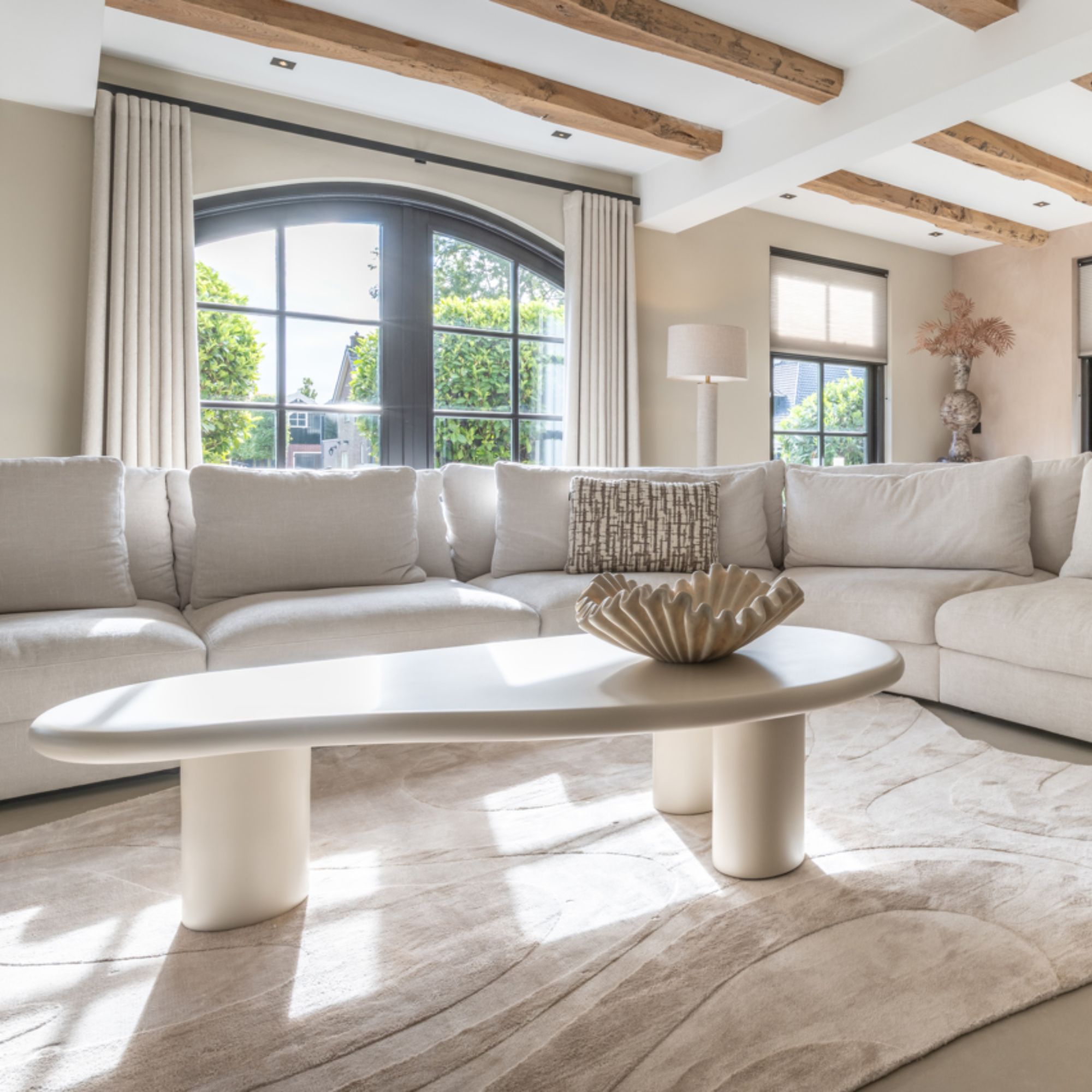The Montford coffee table features an organic shape, rounded legs and a smooth contemporary finish, creating a calm and modern centrepiece.