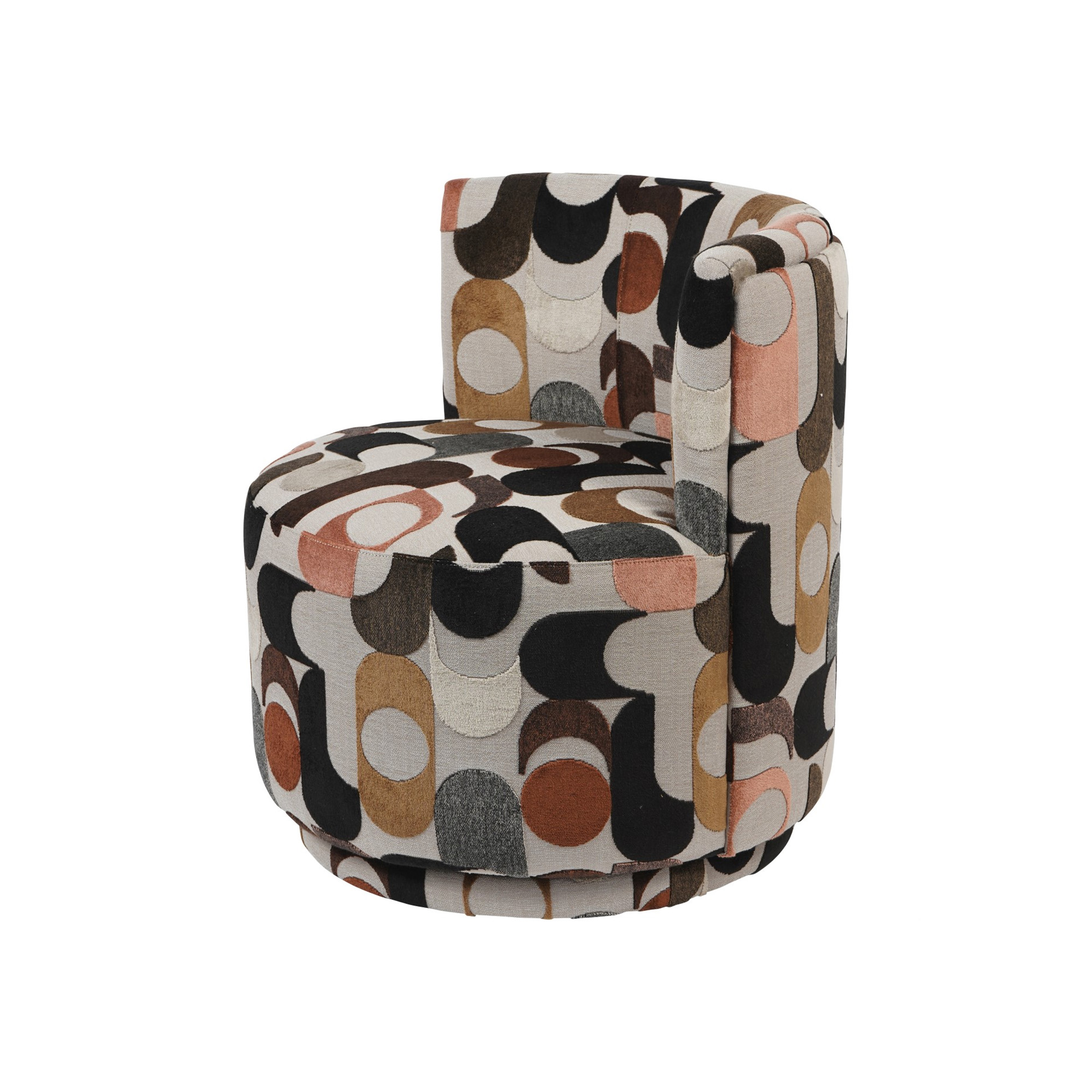 Expressive and compact, the Portico Velvet Swivel Chair brings sculptural style to modern interiors. Upholstered in trendy sub-velvet, its retro-inspired pattern blends warm neutrals with ochre, blush, and espresso tones. The low curved back, cushioned seat and hidden swivel base ensure comfort and effortless movement, making it a bold accent piece for any space.