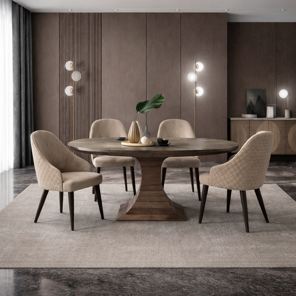 The Opera Rectangular Dining Table features a thick natural stone top with a distinctive “boat edge” profile and a meticulously handcrafted solid beech wood base. Each piece of stone is unique, creating an opulent and one-of-a-kind surface that adds character and luxury to any dining room. Paired with four Lynne Low Back Dining Chairs, this set balances sculptural presence with graceful design. The Lynne chairs offer a sleek silhouette and gently tapered backrest, with options for quilted back upholstery and personalised leg finishes to complement your interior style perfectly.