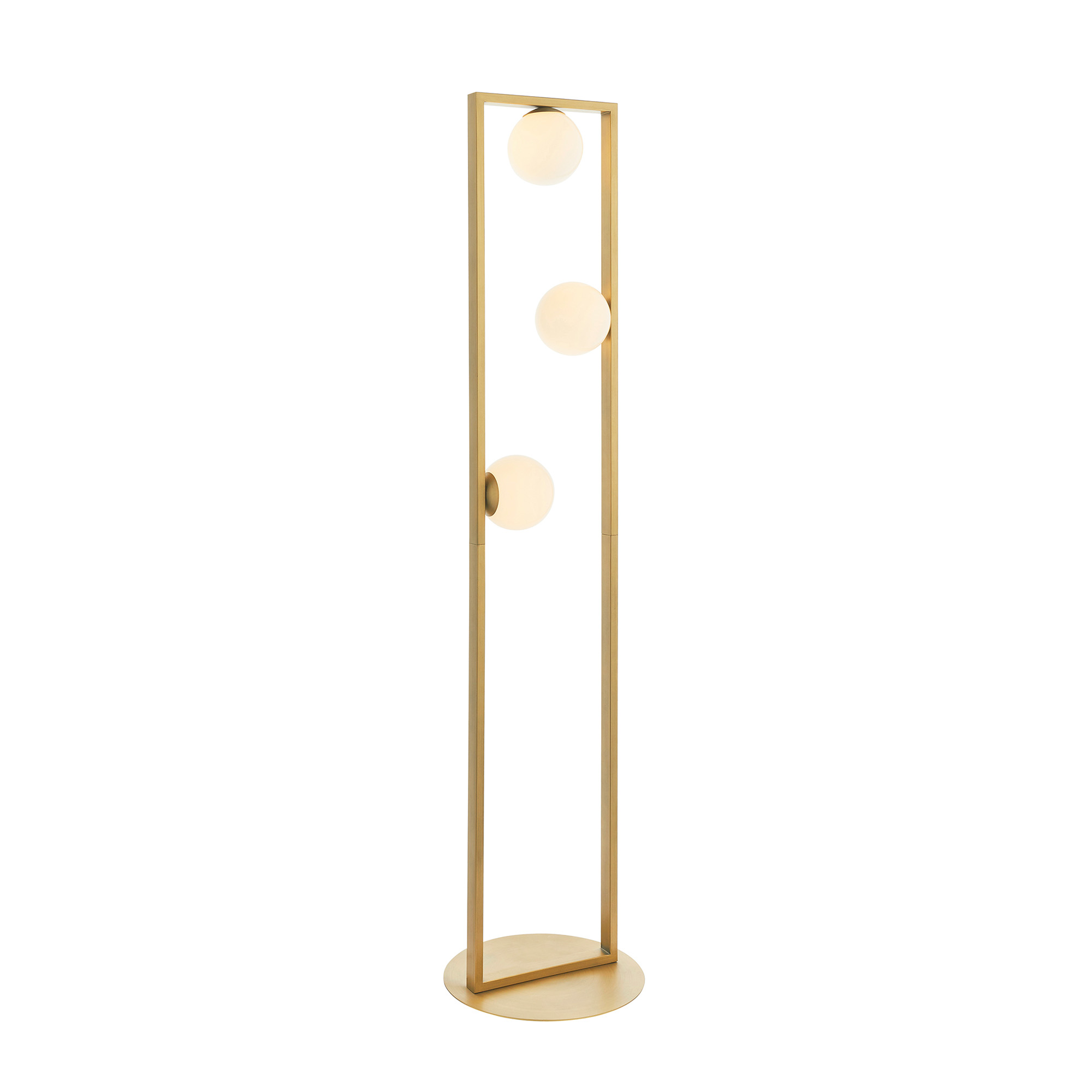 Illuminate your space with this sleek geometric Teo floor light in brushed gold. Featuring an angular, asymmetric brushed gold stand, it supports three opal glass spheres that cast a warm, atmospheric glow. Perfect on its own or paired with the matching table light from the same range for a coordinated, modern aesthetic.