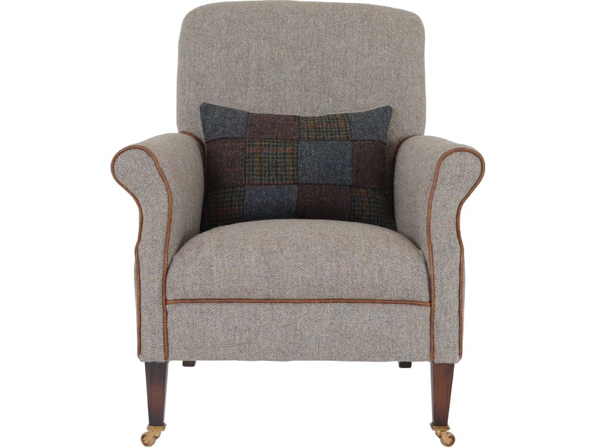 Made in the UK Hardwood frame Coil sprung seat Hide piping Wooden tuned legs Feather filled scatter Choice of 100% pure virgin wool Shown in Heather Tweed with Brompton Tan pipingProduct Specification