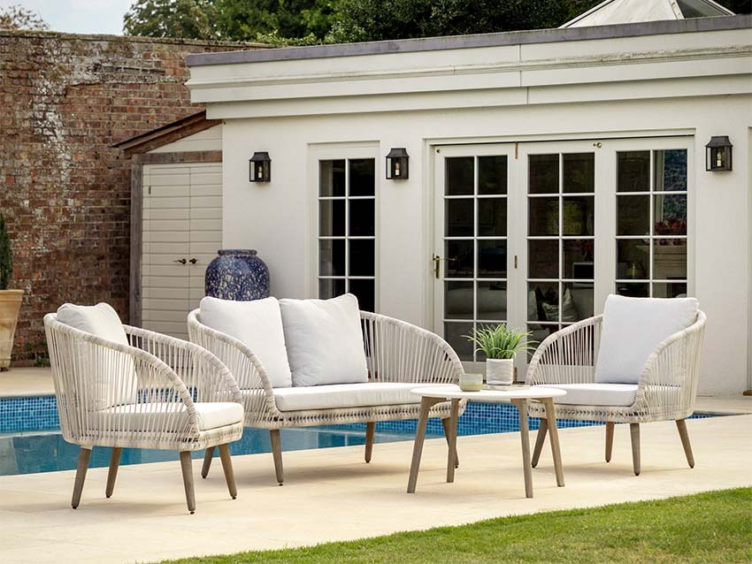 Modern Design: Woven wicker design and chic turned legs create a stylish and contemporary look for your outdoor space. Comfortable Seating: Plush cushions on 2 armchairs and a 2-seater sofa ensure ultimate comfort while relaxing outdoors. Durable Materials: Woven wicker, steel frame, and UKFR fire retardant foam cushions for long-lasting use. Coordinating Coffee Table: Complete the look with a matching coffee table, perfect for drinks and snacks. Four Seats: Provides comfortable seating for four people. Easy Assembly Required: Set includes all necessary parts and instructions for assembly. Dimensions: Table - W70.5 x D70.5 x H45, 2 Seat Sofa - W143.5 x D80 x H78, Chair - W78 x D80 X H78Toulouse Outdoor Woven Lounge Set