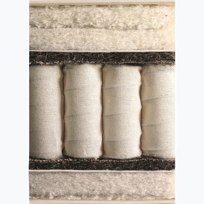 Hand nested calico pocket spring construction Made with hand-teased British fleece wool Upholstered with Protective Wool 2 rows of hand side stitching Choose from Soft, Medium, Firm and Extra Firm tensions