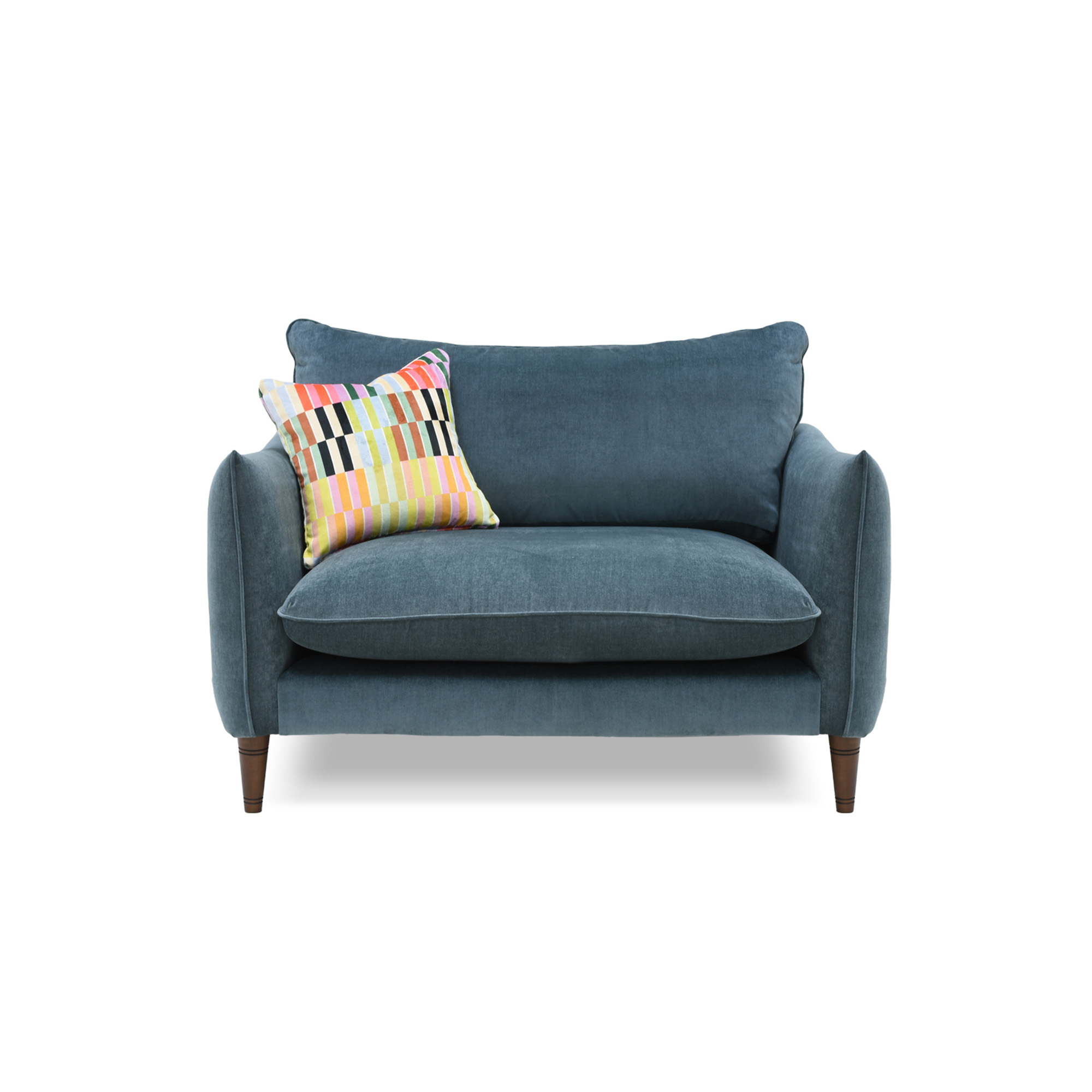 Trendy, bold and full of personality, the Vogue Williams Kenmare Cuddler reflects a confident approach to colour and contemporary design. Its charming silhouette is defined by sleek dipped arms and neatly balanced proportions, creating a piece that feels both playful and refined. Raised on solid wood legs, the design maintains a light, elegant profile while offering a comfortable place to relax. A fixed seat cushion with a foam and Dacron interior provides supportive comfort, making the Kenmare a characterful yet practical choice for modern living spaces.