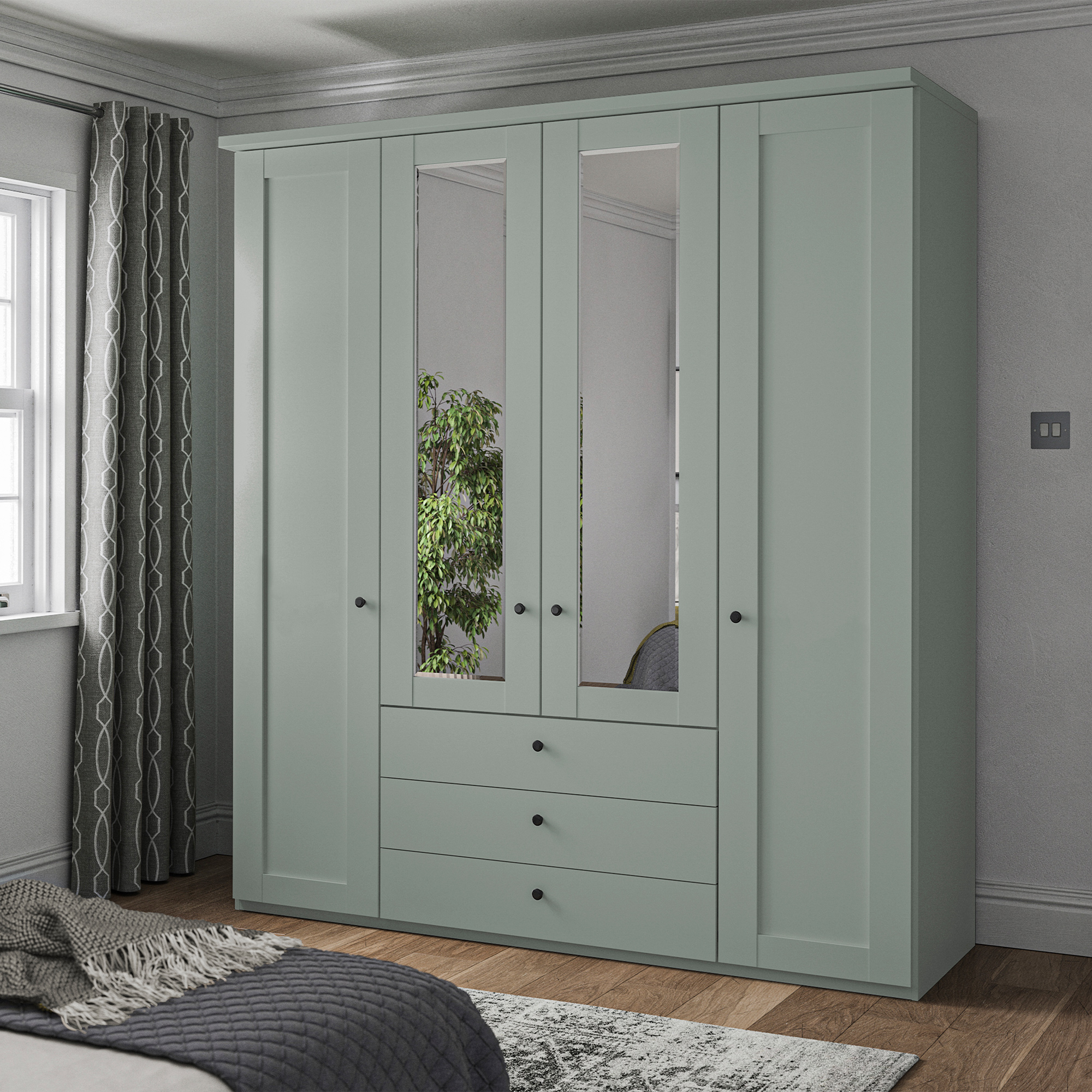 This 200cm layout includes two wooden outer doors, two full-length mirrored central doors and a three-drawer unit positioned directly beneath the mirrors. This practical configuration offers a balanced mix of hanging space, shelving and drawer storage, while the mirrored doors help brighten the room and create a more spacious feel.